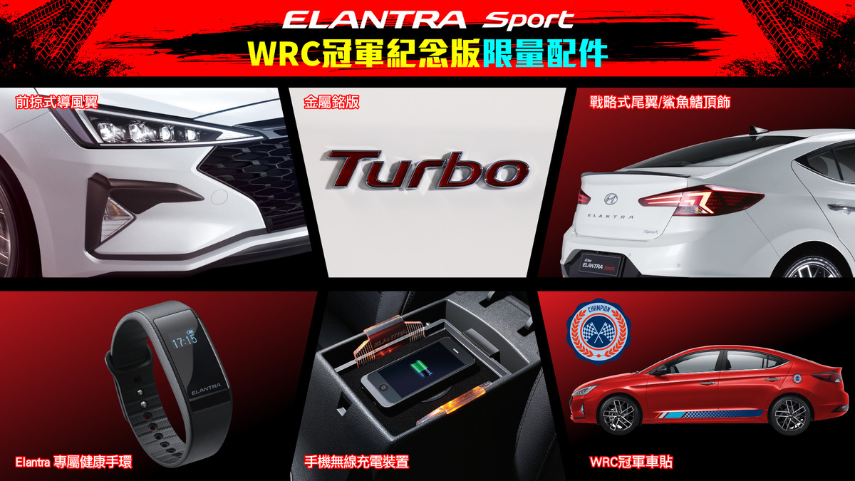 全新ELANTRA Sport WRC冠軍紀念版,不僅外觀車側以方格旗意象的深藍圖裝彰顯ELANTRA Sport WRC冠軍紀念版的不凡身分,更擁有導風翼、尾翼、Turbo銘版與車頂飾蓋等個性化套件點綴;此外,為了讓駕駛在熱血之餘也能同時展現個人時尚潮流魅力,入主ELANTRA Sport WRC冠軍紀念版再加贈H-Band專屬健康手環以及手機無線充電系統,透過和智慧型手機藍芽連結(註2),H-Band專屬健康手環除了提供時間提醒、睡眠深度與運動步行的健康管家紀錄功能,也兼具提醒未接來電或者協助找尋遺忘在角落的手環鑰匙,讓車主們日常使用便利大大增加。