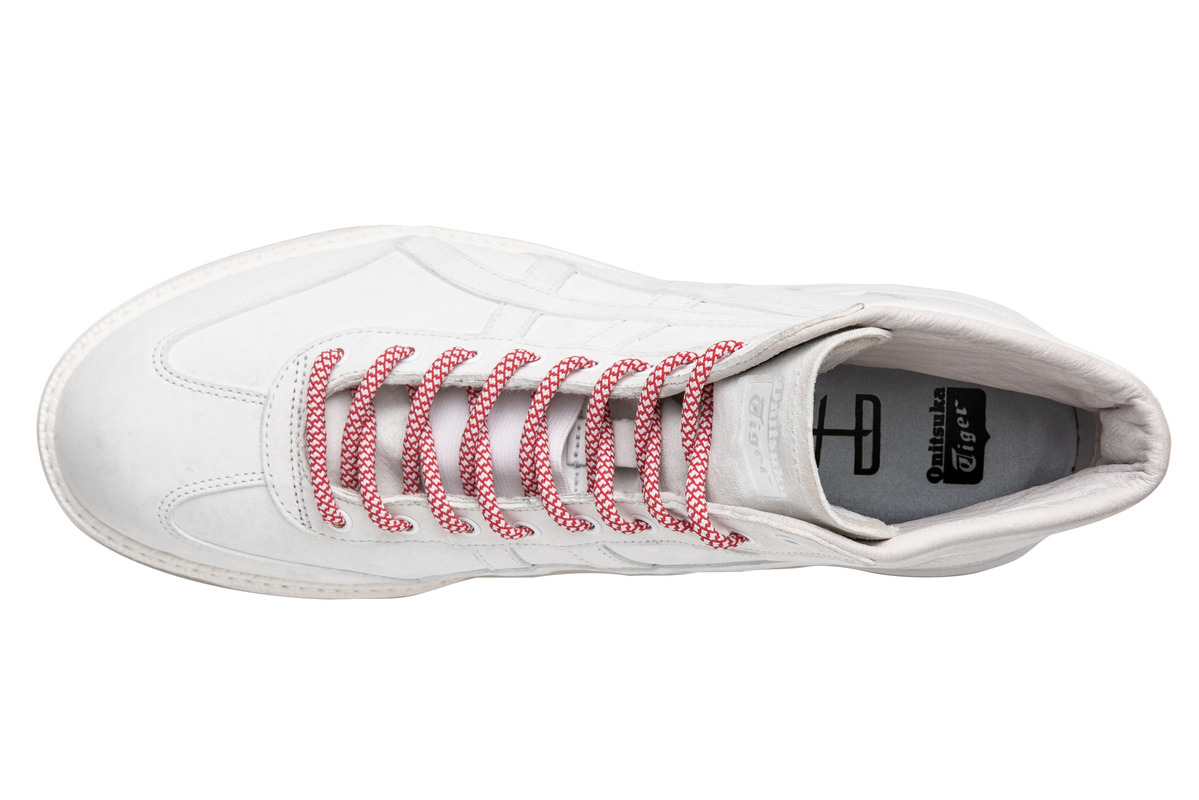 本次70周年的RINKAN BOOT™設計聯名款,其靴筒較原始設計高出3公分,高筒靴的線條使輪廓更流暢,也能把褲管塞進靴內、配合更多元的穿搭。鞋底採二種異材質的白色設計,半透明的乳白色橡膠底的色彩靈感也來自山下智久的旅行經驗。RINKAN BOOT™鞋面選用簡潔的白色天然皮革,經表面磨砂處理產生柔軟觸感。本設計提供三款鞋帶,並帶有反光效果,使鞋帶在光線下閃爍光芒,與柔白鞋面的溫潤色澤相映。山下智久在他於西班牙旅遊時設計出這雙聯名靴款,南歐色彩斑斕的美景、以及樹上盛放的豔紅花卉讓他驚豔,他拍下花朵和當地鳳凰木的照片,並將此做為鞋盒上的圖騰設計。紅花與白鞋相映的顏色設計也如同日本國旗的配色,傳承鬼塚虎的日式職人元素。