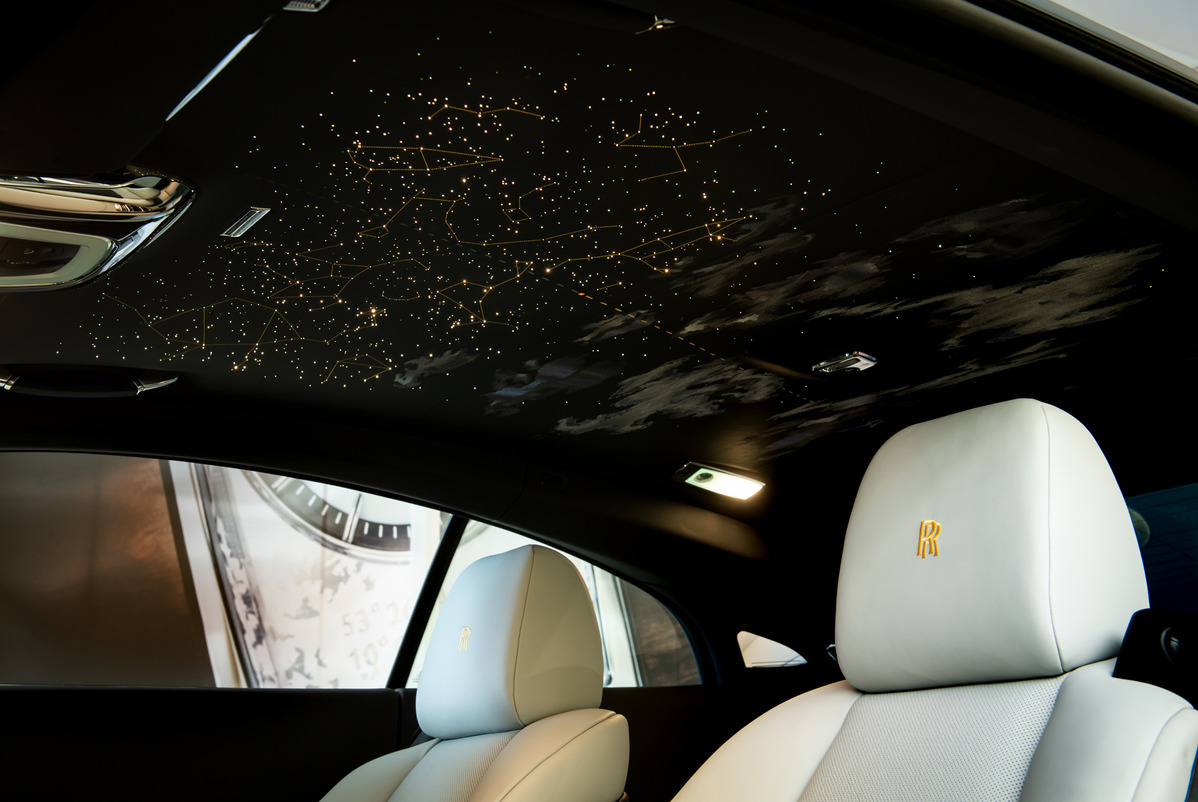 勞斯萊斯的內裝設計當中最精采的莫過於獨特的星光頂篷。在Wraith Eagle VIII的星光頂篷上面設計團隊複製了1919年6月15日當時的星象位置,以1,183個星點及精緻的雲層刺繡重現當時大西洋上的夜空,然後加上銅色虛線來表示飛行路徑,飛行路線上的紅點代表著兩位飛行員衝出濃霧開始仰賴星空導航的時刻。勞斯萊斯Bespoke客製化除了是產品細節的呈現,背後的故事傳遞與致敬也是勞斯萊斯客製化精神之一。