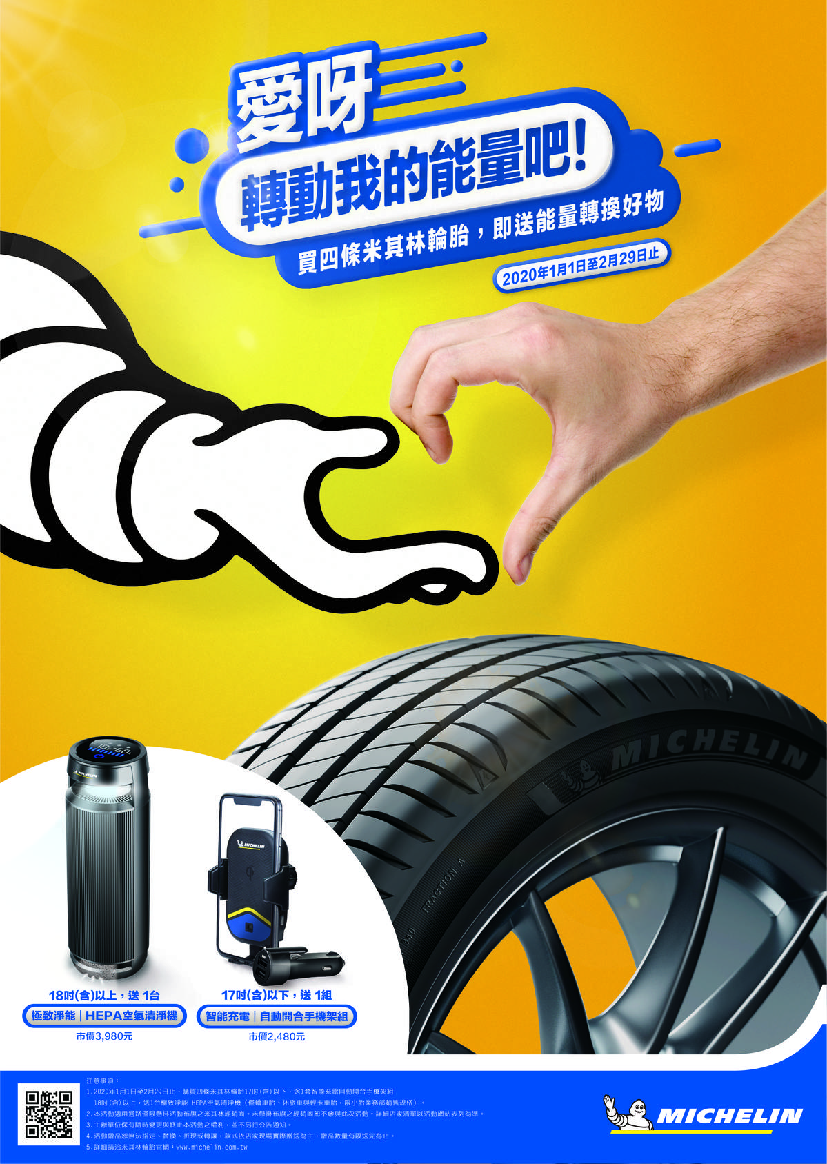 台灣米其林設計新年活動好禮即將推出,自2020年1月1日起至2020年2月29日止,於米其林指定經銷通路購買4條13吋至17吋米其林輪胎(註1.2.)即贈「智能充電 自動開合手機架組」,行車時充電最佳的工具,輕鬆取機好方便;而購買18(含)以上吋米其林輪胎(註1.2.),即送「極致淨能 HEPA空氣清淨機」(註3.),長途跋涉沒在怕,讓米其林專屬的好禮,創造清新好空氣,開車旅行不怕累。