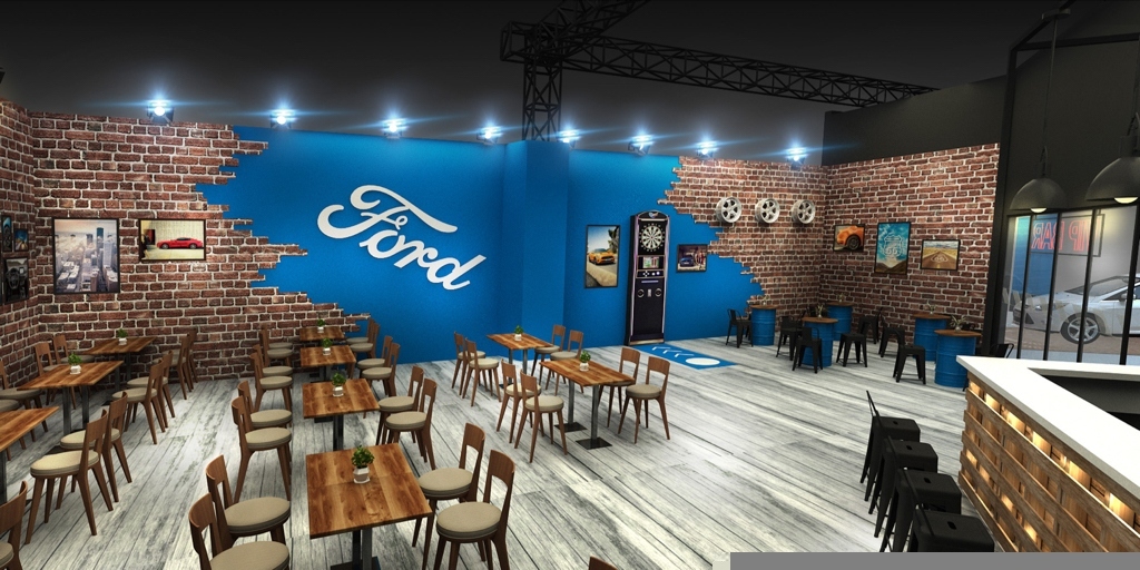 Ford以最能代表美式精神的美國66號公路作為2020世界新車大展展區主題,以公路大道、休息站、美式大型看板及霓虹燈元素,神重現公路城鎮的經典樣貌,並以美式鄉村酒吧概念鋪陳客戶洽談區,提供美式特色餐飲小點,打造沉浸式體驗展區,力求讓每位車展訪客宛如置身美國公路城鎮一角,感受純正美系品牌魅力。