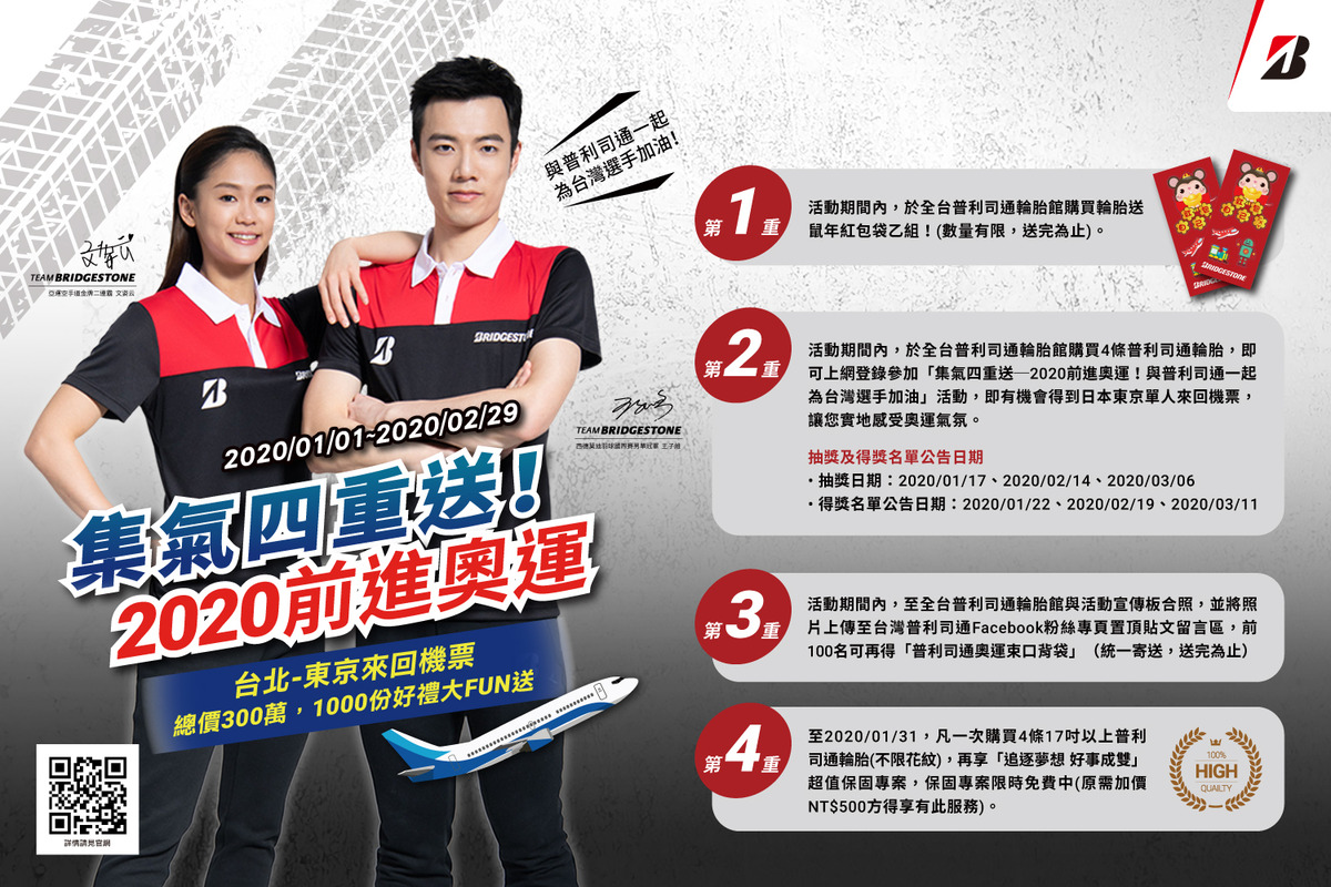 隨著2020東京奧運的接近,台灣普利司通誠摯邀請民眾一同為選手們加油,推出「集氣四重送」活動。第一重:自2020年1月1日至2月29日止,凡於全台普利司通輪胎館購買4條普利司通轎車/休旅車輪胎,即可上網登錄參加「集氣四重送 - 2020前進奧運!與普利司通一起為台灣選手加油」抽獎活動,獎項總價300萬,超過1,000份好禮大Fun送。抽獎獎項不僅有國際知名品牌除濕機、吸塵器、烘烤爐等好禮外,更有機會獲得羽球王子-王子維與空手道小清新-文姿云限量簽名商品,以及台北-東京來回機票。第二重,於全台普利司通輪胎館購買轎車胎/休旅車輪胎,就送鼠年紅包袋乙組(數量有限,送完為止)。第三重,如至全台普利司通輪胎館與活動宣傳版合照,並上傳FB粉絲專頁,再送「普利司通奧運束口背袋」(數量有限,送完為止)。第四重,自2020年1月1日至1月31日止,凡一次購買4條17吋以上普利司通輪胎(不限花紋),再享「追逐夢想 好事成雙」超值保固專案限時免費(原需加價NT$500方得享有此服務)優惠。