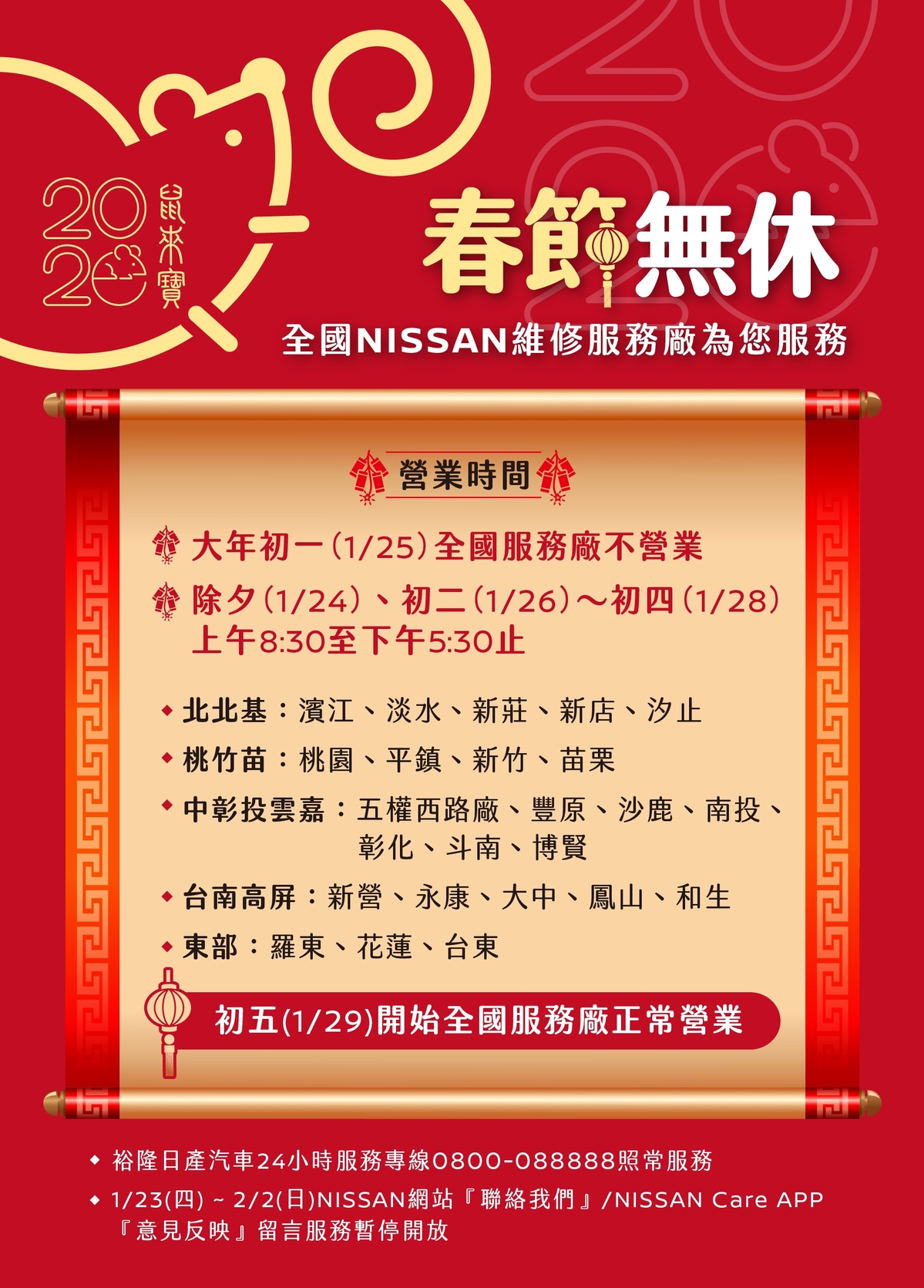 註:2020年1月25日(初一)全台NISSAN服務廠休假,1月29日(初五)起各服務廠開始正常營業。