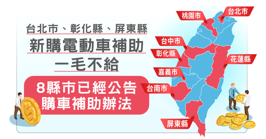 根據最新資料顯示,目前共計八個縣市已經公告,不再補助購買電動車(新購條件)共計三個縣市「台北市、彰化、屏東」;而補助調降最多者為花蓮高達(-50%),其次桃園(-40%)、台南(-20%)。