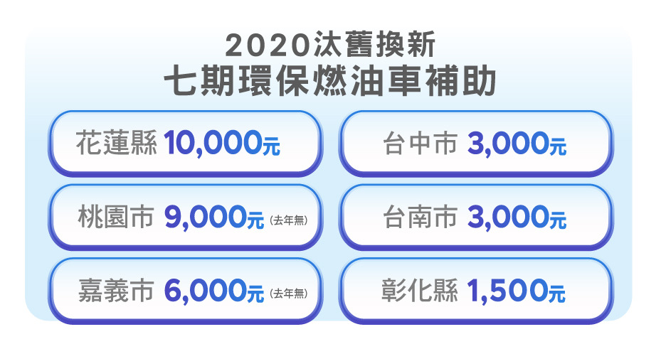 據了解,中央、地方同步調逐年減少或取消電動車補助,反而增加對民眾購買七期環保油車的購車補助,鼓勵民眾選購省油、汙染減少9成的國家認證七期環保燃油車。在適用二行程與四行程的汰舊換新購車補助下,東部花蓮最高補助,高達10,000元、西部縣市目前是桃園補助最高,達9,000元,其次是嘉義6,000元,加上政府統一補助ABS車款4,000元,大幅減輕民眾購車負擔。