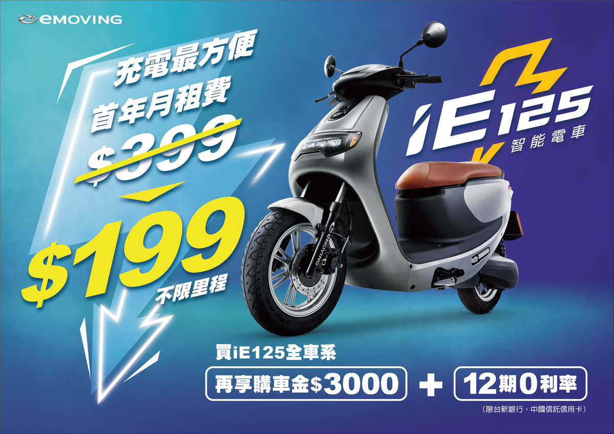 為了讓民眾能在這不景氣的時代,輕鬆享受到最新智慧科技、舒適方便的騎車感受,即日起至三月底止,只要購買iE125 系列任一車款,就能以首年基礎型月租費199元(原價399元)享受最便利的充電生活模式,再享3,000元購車金,及12期刷卡0 利率;以嘉義市為例,補助後月付不到4,000元就將iE125輕鬆騎回家,讓新生活超容易、每月用車無負擔!!