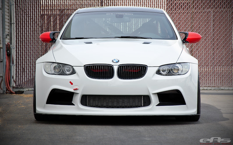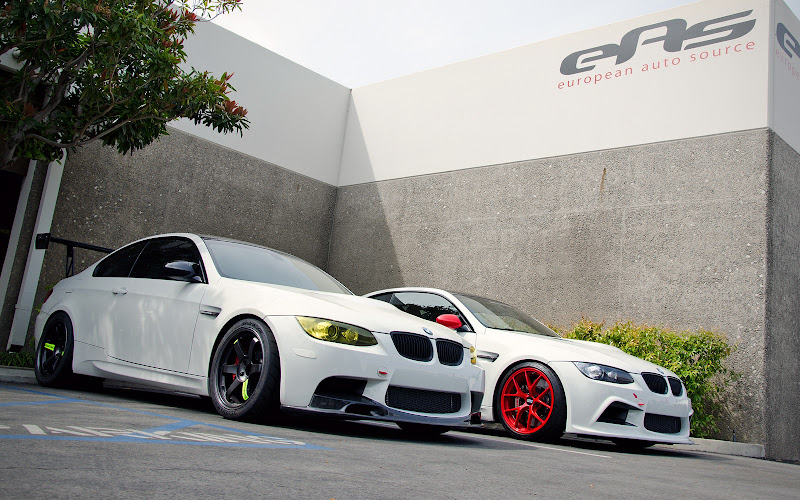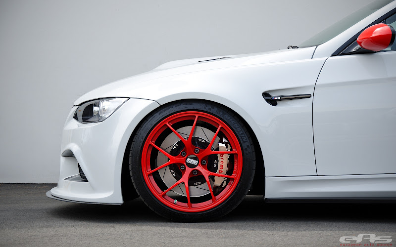 這台同樣是原廠色碼300白色的BMW E92 M3,採用紅白配色,前保桿為Arkym產品,後視鏡、輪圈、內裝與防滾籠等處則以紅色處理,另外裝上BMW Performance碳纖維尾翼,視覺上相當搶眼。