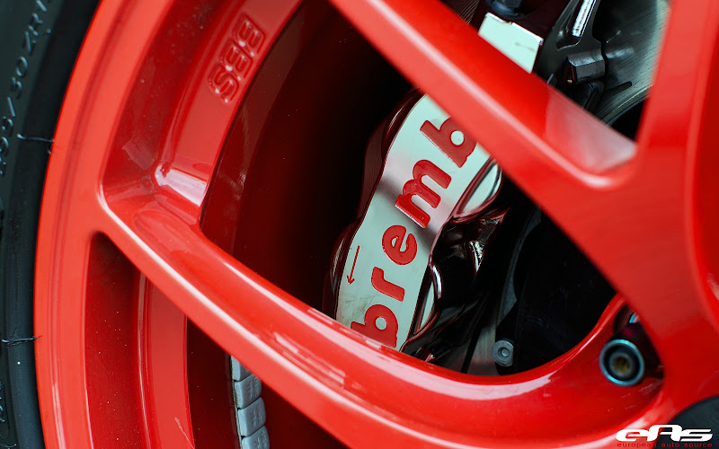 輪圈用上BBS RI-D鍛造款式,紅色塗裝與車內防滾籠互相呼應。除此之外,用上Brembo煞車系統改善制動效果。