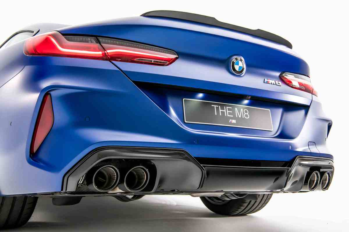 首度強悍登台的2020年式BMW M8 Coupe與M8 Gran Coupe車型將皆搭載氣勢凌人的Racing Package,M運動化排氣系統擁有雙邊雙出的黑色排氣尾管,隨著轉速直上的排氣聲浪更加渾厚澎湃;專屬的碳纖維外觀套件以碳纖維材質打造車輛前下擾流、車側導流氣孔外框、水滴型後照鏡蓋、後保下擾流板以及M擾流尾翼,運動化十足且臻至完美的細節,建構出全新BMW M8不凡的王者霸氣。