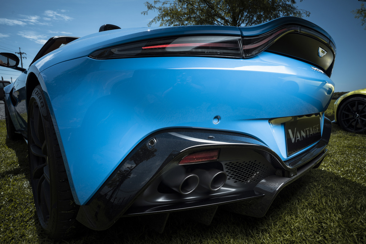 此次來台首演的Vantage Roadster選用全新21年式亮眼車色Ceramic Blue;下擾流片前側、後分流器及側裙,皆採用亮黑色擾流套件加以點綴,窗框與前車側導流鰭片則選擇黑砂面材質,20吋輕量化黑砂面鍛造輪圈與黑色剎車卡鉗相互呼應,體現低調細節美學。在車尾呈現上,交織斜紋碳纖維後分流器內崁飾板搭配燻黑色尾燈,於原有的野性意象中再添率性風格。此外,ASTON MARTIN為慶祝Vantage 70周年,特針對Vantage車系推出品牌經典格柵水箱護罩選配,充分展現傳統品牌榮光與嶄新世代花火的完美結合,最新搭配也在此次發表會上首次公開亮相。