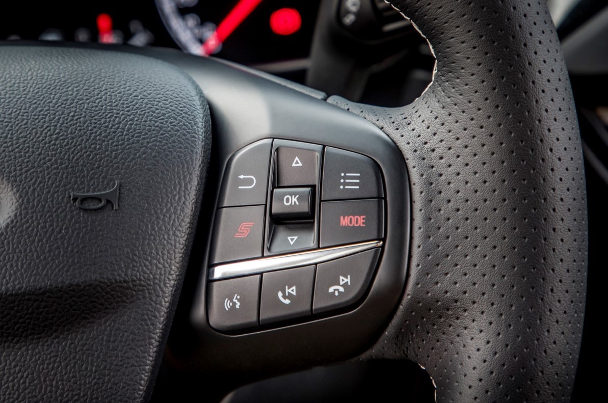 內裝部分,New Ford Focus ST Wagon採用運動碳纖維紋路飾板搭配闇黑頂篷,營造絕對性能氛圍。ST專屬賽道級RECARO運動跑車座椅更是座艙內最具戰鬥氣息的靈魂所在,提供出色的支撐性與包覆感受,在激烈操駕下也能維持駕駛人的姿勢與舒適度。而ST專屬平底運動化方向盤則於右側多功能按鍵附「S」按鍵與「Mode」選擇模式鈕,駕駛人可在目不離路的狀態下迅速切換動態模式。