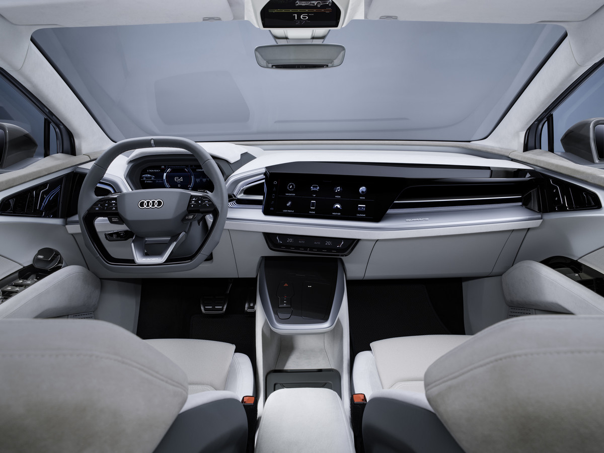 受惠於埋藏與車身下方平整化的電池模組設計,Audi Q4 Sportback e-tron concept 免除中央傳動軸與排氣管的限制,擁有長達 2.77 公尺的軸距,讓車室內部座艙的規畫更為寬敞舒適,使車室空間能突破A級距車身尺寸的限制,達到C級距的空間表現。而在前座駕駛座艙部分,採用以駕駛導向的規劃,中控台上方嵌入 12.3 英吋觸控螢幕,用車人可輕易透過語音與觸碰的方式操作中央娛樂系統和車輛功能。而中控台則不需安排傳統排檔桿等功能元件,因此可作為手機無線充電座並提供寬敞充裕的儲物空間。此外,Audi Q4 Sportback e-tron concenpt更運用擴增實境技術於大型抬頭顯示器,可將重要的交通號誌、限速、圖像指標等行車資訊,精準投射顯示於眼前擋風玻璃上,駕駛眼睛無須重新聚焦,大幅度提升駕駛人用車的輕鬆度與便利性。