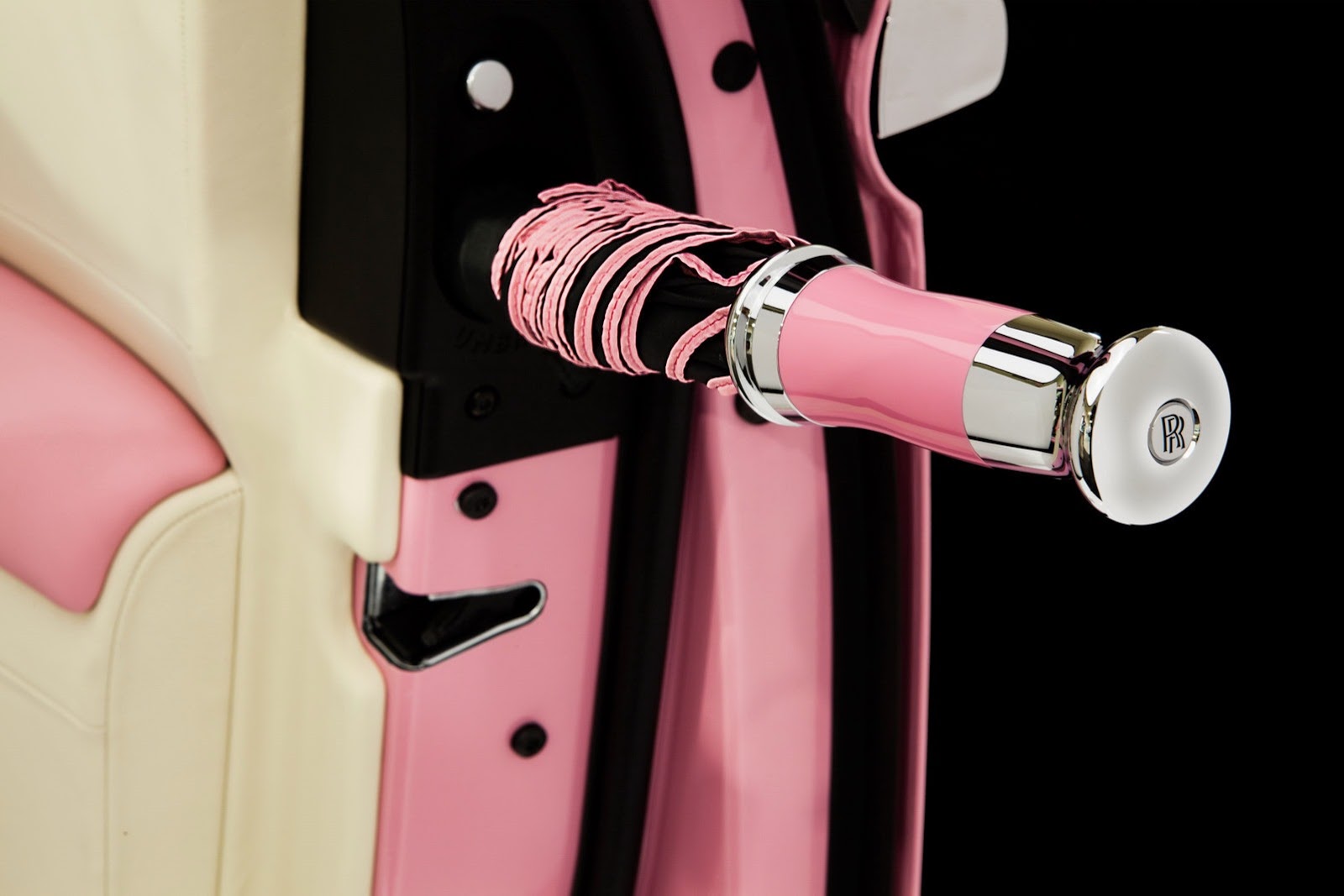 這輛車命名為Ghost FAB1,不只是只有在外觀講究,在其內在也在重點部分以亮粉紅色妝點,輪圈當然也少不了該色之點綴,甚至該車聞名於世嵌在門中的那把傘也是粉紅色的。