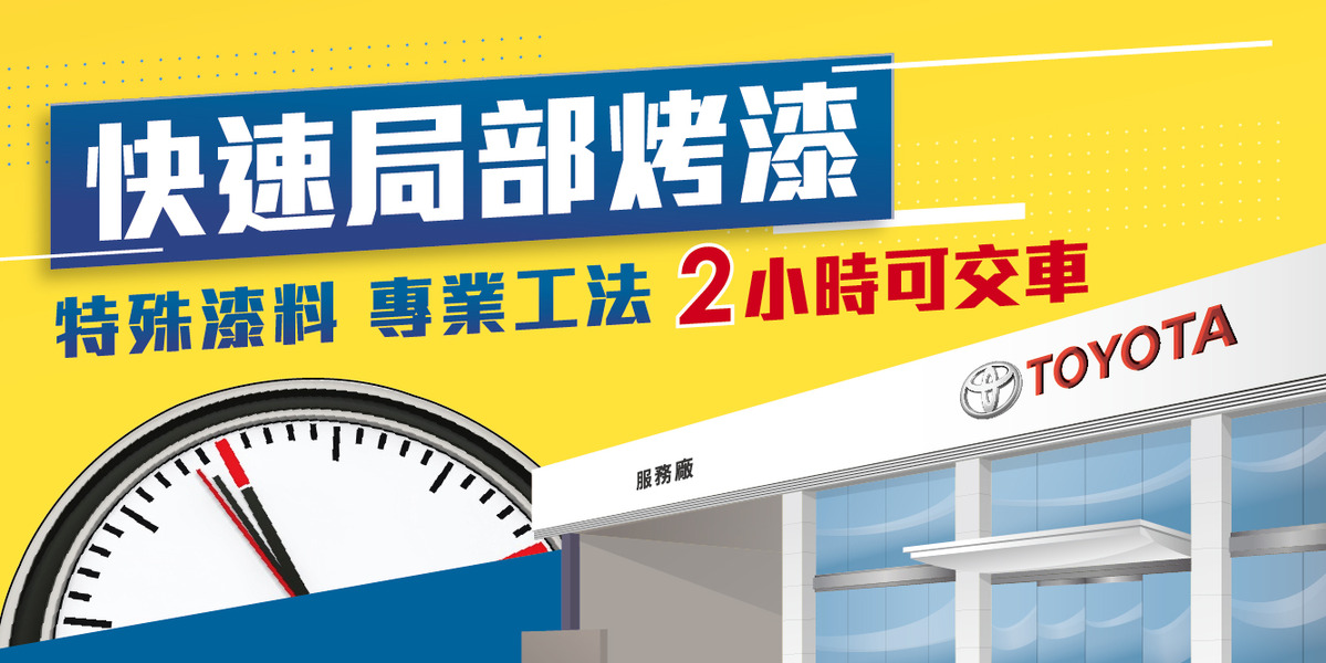 如果是不小心刮傷保險桿、葉子板下緣、後車箱蓋等局部區塊的車主,若原廠出廠的車身烤漆狀態尚佳,TOYOTA建議不需要全車重新烤漆,可以使用快速、經濟的「快速局部烤漆」方案(不分車齡),2小時就能消除車身小刮傷及交車,每1處修復費用最低1,999元,對車主來說,非常便利又實惠。更多「快速局部烤漆」資訊,請參考活動網頁 https://lihi1.com/Ge7Wz。