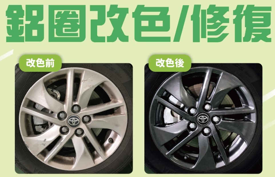 除了車身烤漆修復方案,TOYOTA還有鋁圈改色修復服務,推薦給喜歡常保愛車新穎外觀的車主,TOYOTA提供原廠鋁圈既有漆色,如:炫銀/鐵灰色,以及其它特殊客製化漆色,目前單顆完工價最低1,999元,一次施作4顆可享9折優惠,更多「鋁圈改色/修復」資訊,請參考活動網頁https://lihi1.com/GEntw。