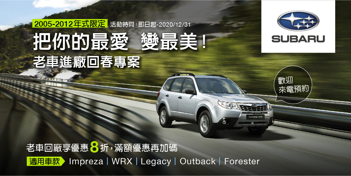 針對2005~2012年式Impreza、WRX、Legacy、Outback和Forester之資深車主回廠,加碼推出「老車回廠優惠專案」: