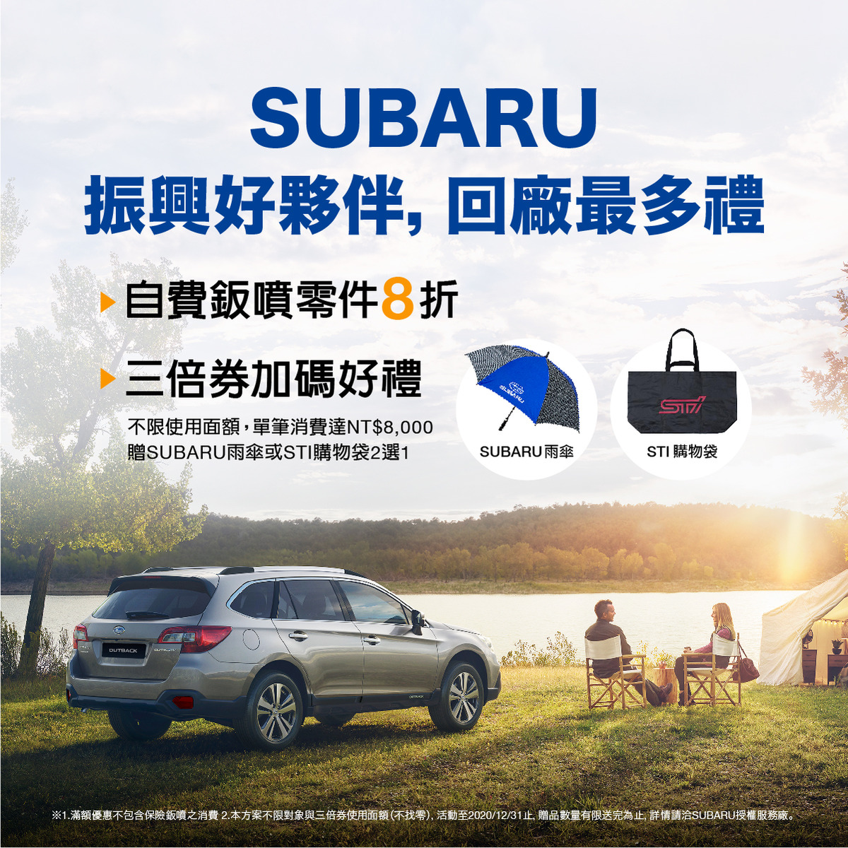 國內伴隨著政府推出振興三倍券創造龐大商機,全台民眾都在熱議三倍券怎麼消費最划算,SUBARU為全台車主貼心設想,即日起至2020年12月31日止,特別推出「SUBARU振興優惠」及「老車回廠優惠專案」,不僅為愛車煥然一新,更讓振興三倍券使用加倍有感!