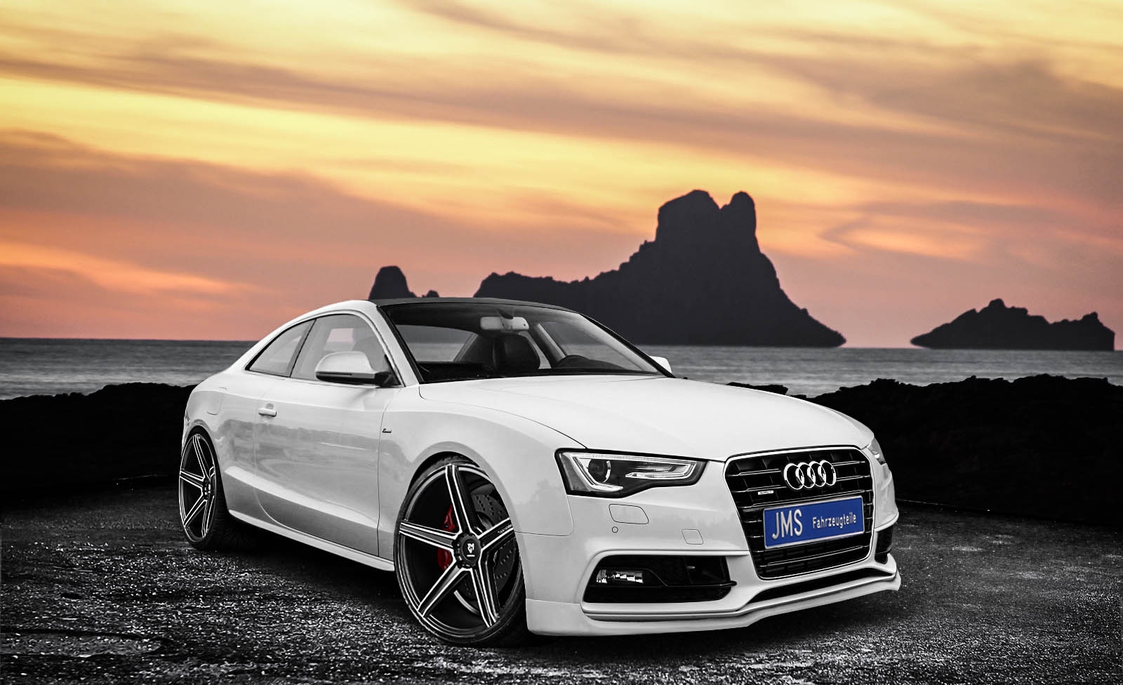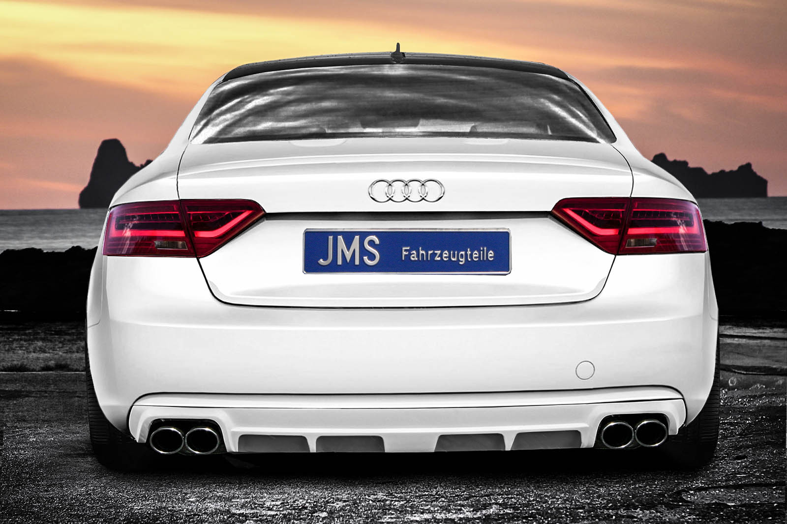 首先,粗略的看上去,其車體變得更為流線飽滿,降低的懸吊搭配20吋輪圈。 德國改裝廠JMS最近推出他們最新的外觀改裝套件,是特別為了幫Audi A5改頭換面而生產的,特別是為那些沒有S-Line套件的A5帶來佳音,這套整體外觀套件包括前保險桿及與車體鈑件整合的排氣管。
