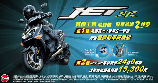 除了JET SR上市後廣受市場好評,三大特色改款功不可沒,分別是:R世代引擎降低損耗,動力輸出更順暢;LED雙魚眼大燈、光條式潮流尾燈讓照明效果激增,造型也更加帥氣;輕量化鋁合金輪框減輕簧下重量,讓操控更犀利。此外為了回饋車友,八月底前凡購賣JET車系任一車款,即贈連霸冠軍精品組;再享JET SR購車24期0利率,舊換新最高補助15,300元。收藏王者風範趁這次,敬請把握!