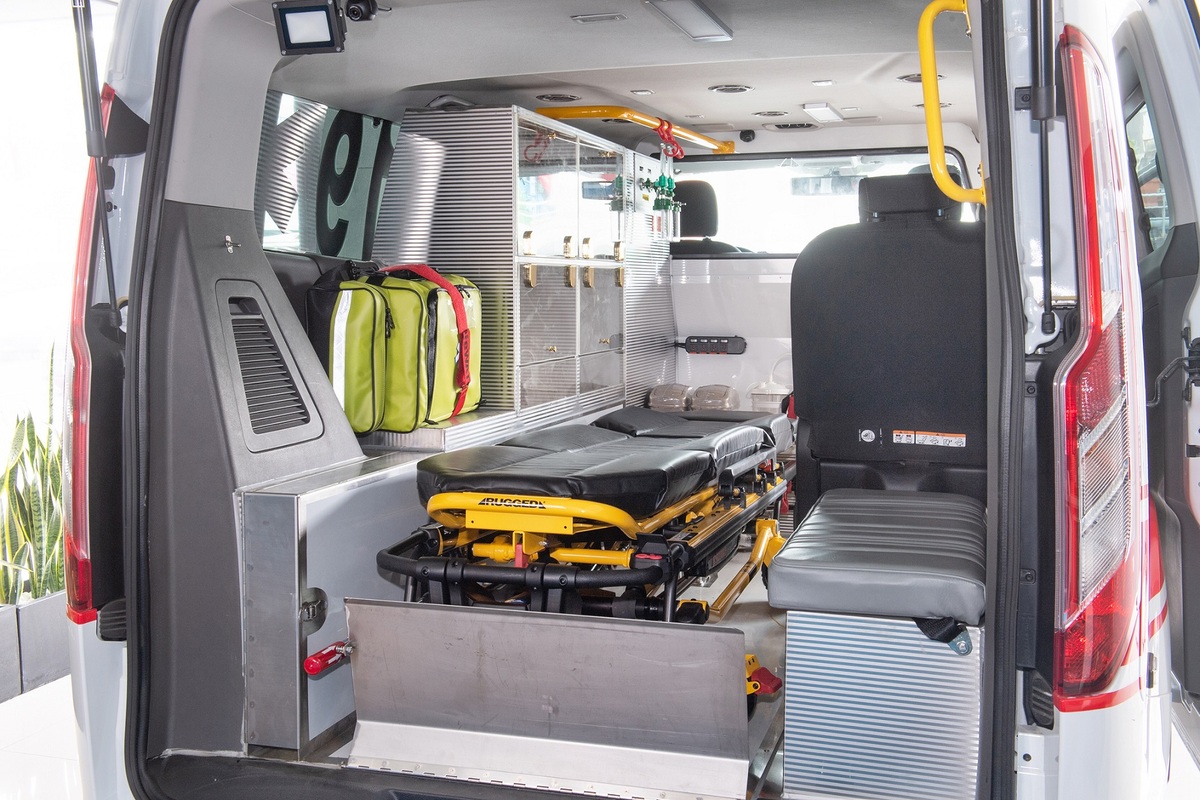 往往災難發生的現場,消防人員所從事的不僅僅是災害控制,生命救援更是首要目標,從現場被救出的傷患最需要的就是緊急醫療處置,通常事故現場相對具備最完整急救支援能力的就非救護車莫屬,以Ford Tourneo Custom福特旅行家客製化訂製的救護車即在空間機能上充份展現優勢,方正的車室與果嶺式的平整化底盤創造極大化車室空間,不僅利於救護人員施行急救,也可裝載最完整的急救裝備,包含符合「緊急醫療救護法」所規範的救護車標準配備,例如:無線電通訊裝備、攜帶式氧氣組、生理監視儀、自動心臟電擊器附心電儀等等。此外,Ford Tourneo Custom福特旅行家原車所標配的左右雙滑門與專屬腳踏板,於救護車使用上也可降低醫護人員上、下車的落差。