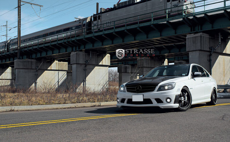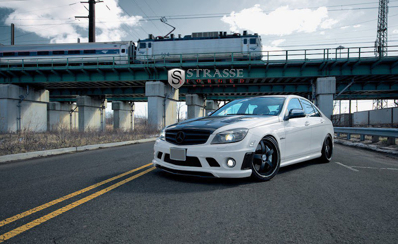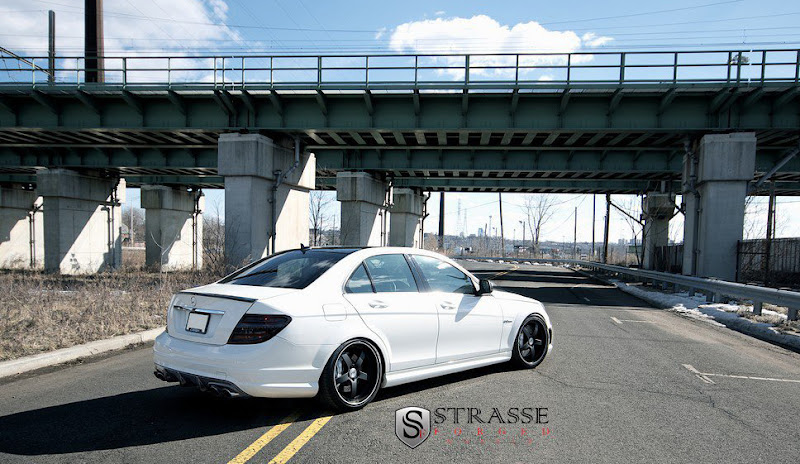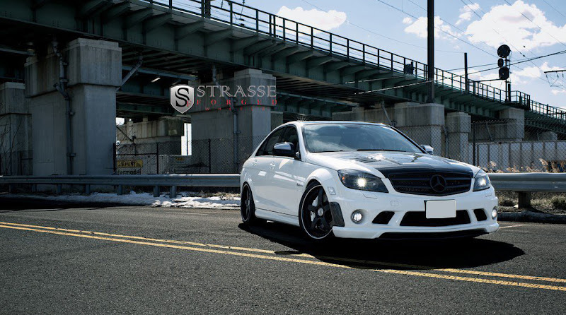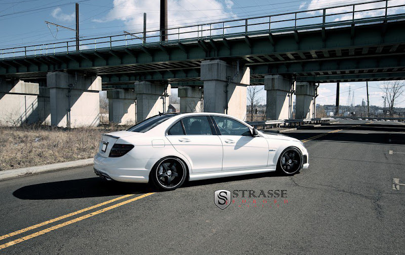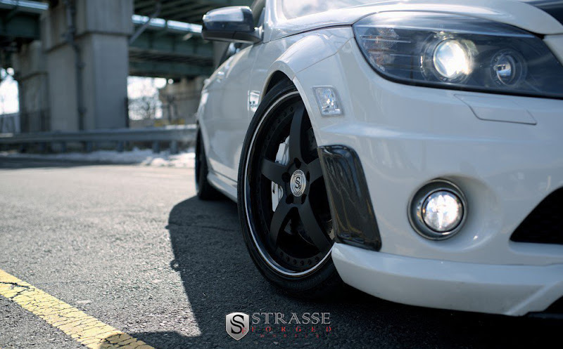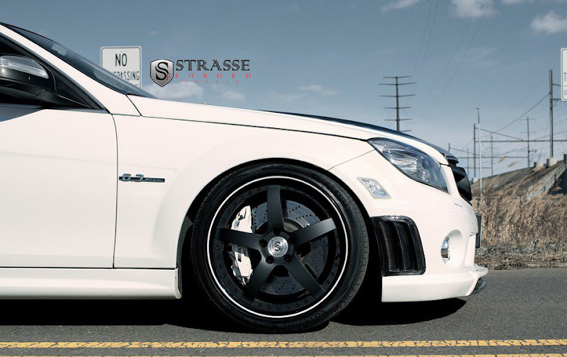 外觀的焦點,當然就是這組Strasse出品S5系列的前19x8.5J、後19x9.5J輪圈,並且採用黑白雙色塗裝,儘管這組輪圈的造型與常裝在BMW車上的Hamann PG系列相似,但是裝在C63身上也別有一番風味。C63 AMG四門款式的車體與底盤設計,無法容納太大的J值,因此若是要追求胎寬的極高值,必須特殊訂製,否則很容易在降低車身後,磨到葉子板或是避震器桶身,而這組來自Strasse的輪圈則是為W204 C63 AMG專門訂做,適用度100%。