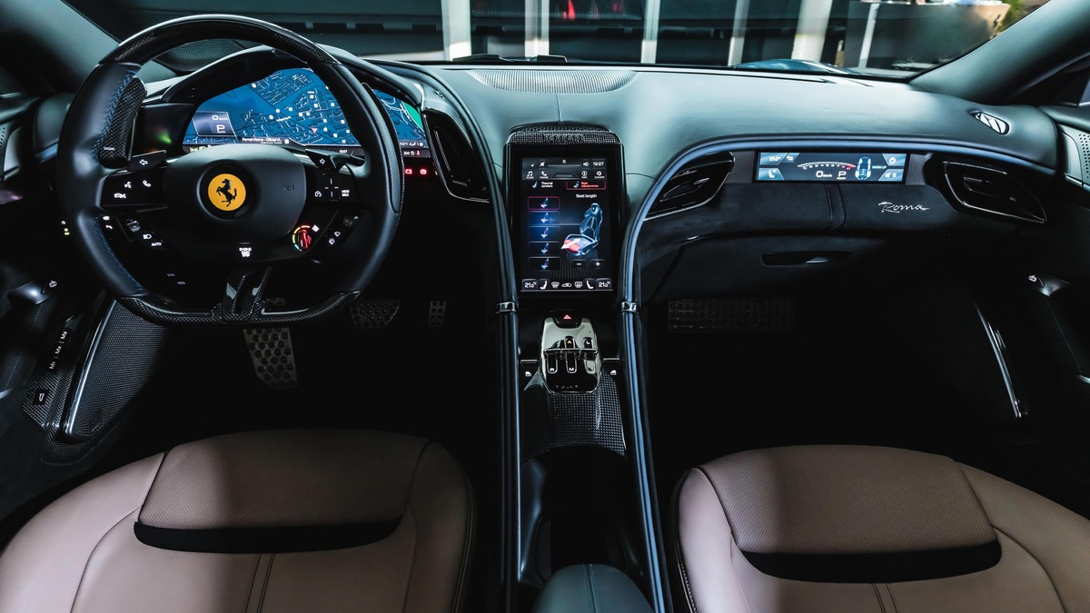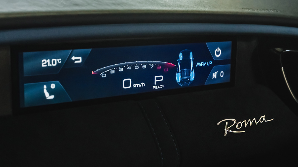 全新開發的HMI人機介面,完美點綴其獨特座艙的樣式,從實踐「眼觀路面,手握方向盤」理念的全新方向盤開始,Ferrari Roma實現了設計領域的飛躍性突破。數位儀錶板由設計優雅的皮革包覆,從儀錶板處自然向外延伸。車輛儀錶資訊為全數位化顯示,並在車輛啟動之前呈現全黑樣式,營造極簡主義外觀,一但按下方向盤上的引擎啟動鍵,所有資訊便以歡迎儀式般地逐一啟動,直至點亮整個座艙。