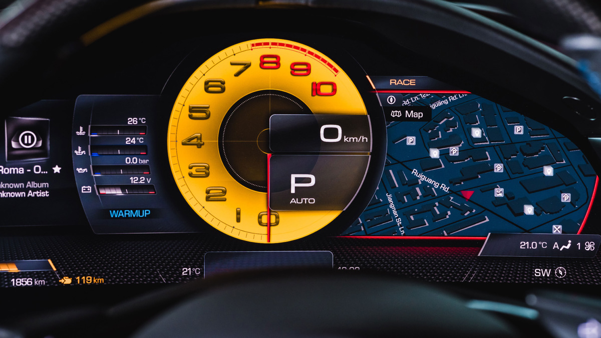 車輛儀錶為一塊16英寸的曲面高解析螢幕,導航和音樂資訊圍繞著經典造型的圓形轉速表,而此螢幕也提供十分靈活的自訂顯示方式,透過方向盤上的控制鍵便可輕鬆操作。以導航地圖為例,所提供的全螢幕顯示模式令使用體驗更為方便且迅速。
