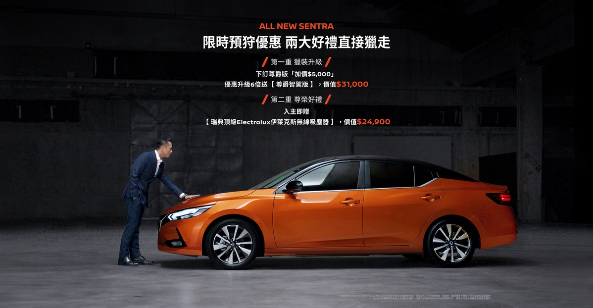 註2:本優惠限於2020/10/05前下訂ALL NEW SENTRA新車並完成領牌程序者,公司法人、大宗批(標)售、租賃車、營業車等不適用。所示金額均為新臺幣。於NISSAN經銷公司領取以上贈品。贈品以實物為準,恕不接受更換或折抵現金,裕隆日產汽車不負任何贈品擔保責任。本優惠專案活動詳情及詳細交易條件請洽NISSAN各經銷公司,經銷公司並保留最後核准與否權利。
