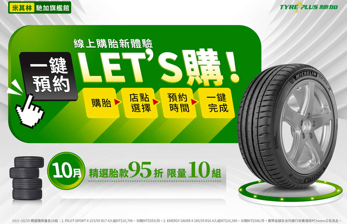 PChome「米其林馳加旗艦館」將於 2020 年 10 月 1 日正式導入一鍵式銷售機制,全面轉換為真正的全自動 O2O 賣場,成為全台首個提供一鍵式購胎服務的電商平台。消費者於PChome「米其林馳加旗艦館」購買輪胎時,僅須決定欲購買的胎款並選擇安裝店家與期望安裝時段,系統將自動配對資訊、完成預約,且透過簡訊發送確認訊息。全部購胎流程在同一頁面,一鍵完成,消費者無須被動等待客服人員聯絡,或擔心因為忙碌漏接電話,購胎便利性大幅提升。快到PChome「米其林馳加旗艦館」享受線上購胎新體驗,一鍵預約 Let’s 購!