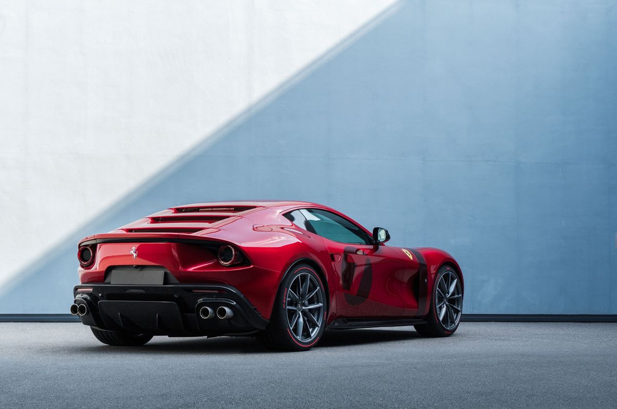 設計師們從各個角度仔細研究了全新車型的外觀和性格,決定採用較扁平的橢圓形格柵,營造出由窄變寬的車頭輪廓。而前輪輪拱的圓潤線條與橫貫在引擎蓋上的拉線設計相互輝映,形成鮮明對比並自然地襯托出車頭格柵的立體感。在車側的車門上可以發現,其有力的肌肉線條恰巧與葉子板的3/4處巧妙連成一線。同時,全新車型取消了後側三角窗,讓整車造型氣勢逼人。車尾上的三條水平線造型使得尾部更加沉降,充分凸顯斜背跑車設計。此外,突出的後擾流板造型不僅強化了車尾的下壓力,也讓整車顯得強悍有力且更加動感。總而言之,Ferrari Omologata就算處於靜止狀態也彷彿蓄勢待發,從車後方看去,其深邃的雙圓燈設計更充分表現出視覺張力。
