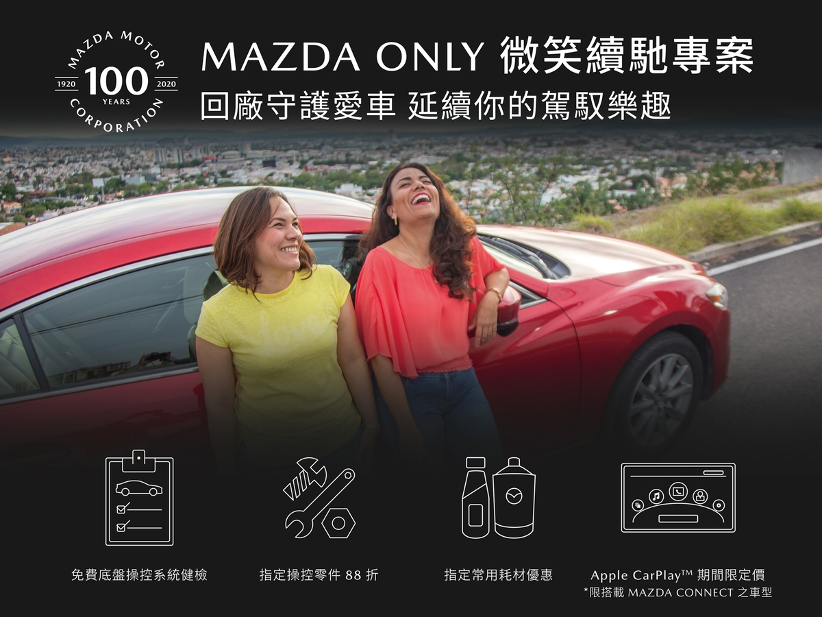 同時,為傳遞台灣馬自達對車主如夥伴般的重視,以及延續MAZDA帶給車主唯一無二的完美駕馭體驗,台灣馬自達自即日起至11月30日止,推出「MAZDA ONLY 微笑續馳專案」,針對現有車主提供免費底盤操控系統健檢、指定操控零件與耗材88折優惠;此外,加碼提供原廠智慧型手機連結的期間限定價,可支援Apple CarPlay™與Android Auto™兩大車載系統,整合多項功能且操作直覺便利,滿足數位時代消費者的行動連結需求。「MAZDA ONLY微笑續馳專案」體貼細心呵護愛車的車主,用最專業團隊,守護愛車持續保持最佳狀態,使MAZDA 100年來不變的駕馭樂趣一路相伴。