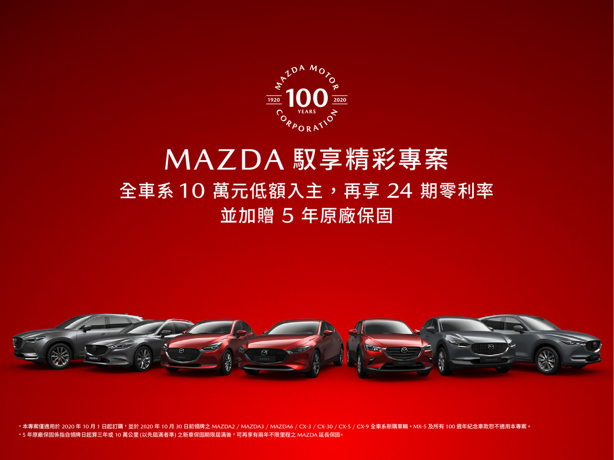 2020年不僅是MAZDA邁向品牌創立100週年的里程碑,更代表百年來MAZDA與許多車主共創美好生活的精采歷程。為感謝消費者長期的支持,台灣馬自達特別於本月起推出「馭享精彩專案」,提供全車系*新台幣10萬元低額入主,再享24期零利率,並加贈5年原廠保固**,在MAZDA 100週年的重要時刻,以豐富多元的購車方案與所有喜愛MAZDA的消費者分享這份榮耀與感動,讓更多消費者能輕鬆入主MAZDA車款,感受MAZDA的丰姿魅力與唯一無二的駕馭樂趣。即日起於活動期間至MAZDA全國展示中心賞車,可獲得MAZDA 100週年精緻禮品乙份,數量有限,送完為止。