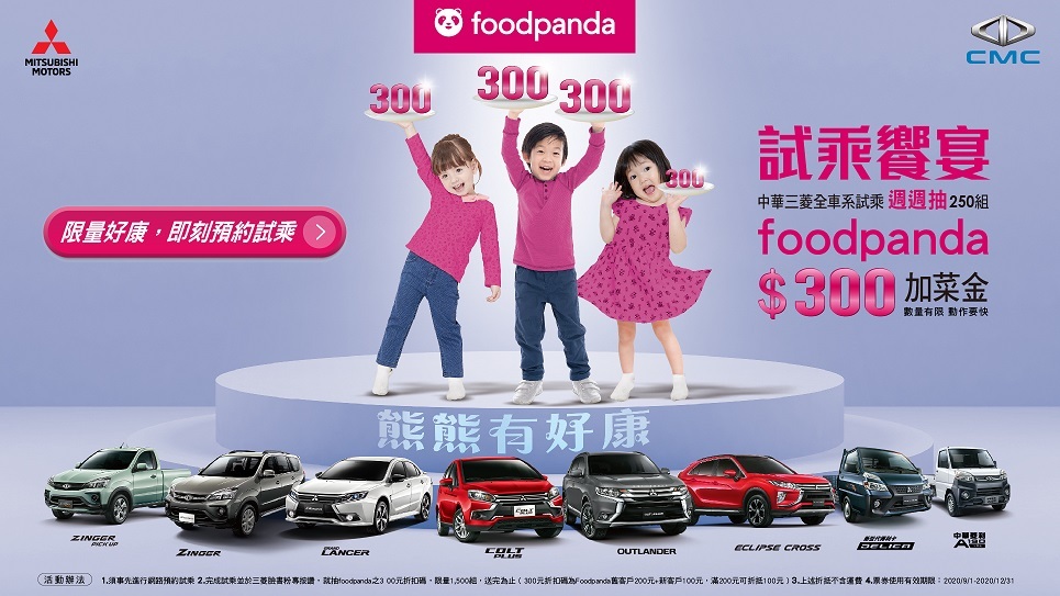 中華三菱提供消費者商車及乘用車最優惠的購車選擇,本月至全台中華三菱展示中心完成試乘COLT PLUS、GRAND LANCER、OUTLANDER、ZINGER、ZINGER PICK UP、ECLIPSE CROSS、DELICA、中華菱利A180及A190任一車款後,並於三菱臉書粉專按讚,就可參加週週抽foodpanda 價值300元之折扣券,限量1,000組,送完為止!本週沒抽中,下週可再累積抽獎機會,越早試乘,中獎機會愈高!