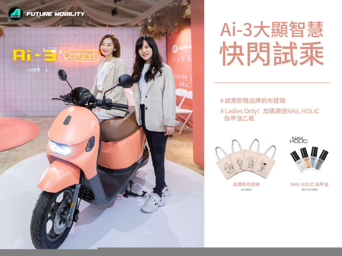 Ai-3 Comfort系列不只是秉持車體貼心的初心而已,在女性消費者中刮起馬卡龍色風潮後,更於全台5個地點要為消費者打造吸睛快閃店並安排試乘活動,特別是快閃店甜美外型,絕對會成為今年秋天街頭的網美打卡新焦點,消息一出後立即引起台灣高絲KOSE的注意,決定與宏佳騰智慧電車一起攜手合作,全力釋放對女性消費者的魅力。於活動期間至快閃店完成試乘,即可獲得台灣高絲KOSE旗下品牌NAIL HOLIC指甲油乙瓶(數量有限,送完為止) ,就是要透過Ai-3 Comfort系列馬卡龍色的指尖魅力,打造自我獨特風格,帶來最美好的試乘體驗。當然,宏佳騰的貼心不只如此而已,加碼再贈送所有的體驗者可獲得品牌精心設計的帆布袋乙個。