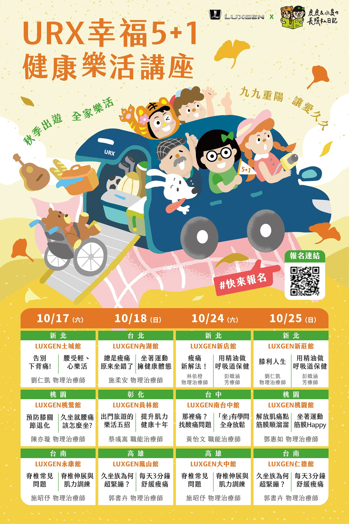 「健康自主新生活」已成為疫後新顯學,隨著重陽節即將到來,LUXGEN除了車輛研發外,也希望貢獻己力回饋,自10/17(六)起免費舉辦全台共12場《URX幸福5+1健康樂活講座》,邀請擁有國家考試證照的治療師團隊分享如何輕鬆地消除疲勞、解除酸痛,是20歲、40歲、60歲都需要的保健密技!主題包含:《用精油做呼吸道保健》、《告別下背痛》、《坐著運動筋膜Happy》等等,多元豐富,不管是乘車久坐,上班或家事勞動造成腰背痠痛,或是行動不便的家人,都歡迎一同至LUXGEN生活館舒展筋骨、賞車兼養生,場次有:10/17(六)於新北土城生活館、桃園桃鶯生活館與台南永康生活館;10/18(日)於台北內湖生活館、彰化員林生活館與高雄鳳山生活館;10/24(六)於新北新店生活館、台中南台中生活館與高雄大中生活館;10/25(日)於新北新莊生活館、桃園生活館與台南仁德生活館,即日起線上預約報名:URX幸福5+1健康樂活講座,名額有限,敬請把握!