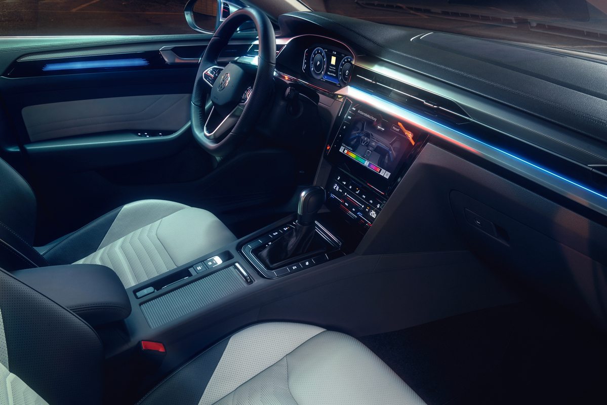車室空間設計猶如居家空間設計,除為車主提供安穩舒適的駕馭體驗之餘,更要彰顯車主的自身品味與不凡身分;The Arteon車室空間宛如一個充滿現代感的豪華休憩空間,舉目所見之處無不滿足現代人對於質感的追求,全面升級的高度數位化座艙,伴隨駕駛入座,首先迎來置於中央的10.25 吋全邏輯數位化儀表,和最新世代的第三代MIB資訊娛樂系統,透過觸控即可操作方向盤、空調、娛樂系統控制介面以及室內氛圍燈,多達30色的選擇,讓車主可隨心所欲變換車室氛圍,高度數位化的內裝與前衛優雅的外觀,帶給車主最極致的享受。