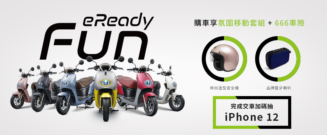 11月試乘及購車活動即日開跑,至全台eReady門市試乘或購車完成領牌即獲得繽紛eReady環保袋,加碼再月月抽iPhone 12。交車更享有eReady節奏藍芽喇叭、品牌安全帽和全方位保險專案「666 好險」。
