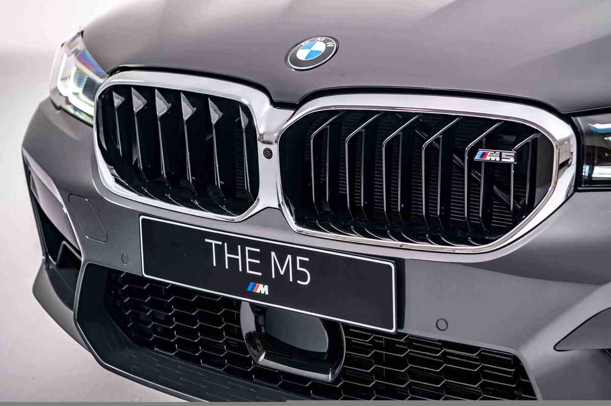 全新BMW M5 在內外觀設計上除了保有純正跑車特質,更增添具現代感與科技感的M專屬設計風格。銳利的L型光條與全新設計的湛藍色智慧雷射頭燈(含Glare-free光型變化功能),一出場就奪取眾人目光;鑲有M5銘牌的全新設計M專屬雙柵腎形水箱護罩,一體成形地搭配寬闊的前下進氣壩,除滿足賽道規格散熱系統的進氣需求,也充分彰顯BMW M5熱血又剽悍的張狂個性。全新BMW M5標準配備19吋M雙輻式輪圈、M複合式煞車系統與運動感十足的藍色卡鉗,另提供耐磨性更佳且重量減少23公斤的陶瓷煞車搭配金色卡鉗的選項配備。沿著M5充滿運動肌理線條的車身走向車尾,印入眼簾的全新燻黑3D LED立體尾燈、全新造型的後保險桿以及雙邊雙出的排氣尾管,飽滿而動感的設計讓充滿速度感的BMW M5更顯簡潔俐落。兼具輕量化與堅固強韌的M碳纖維車頂,更能讓駕駛者在肆意馳騁時如虎添翼。