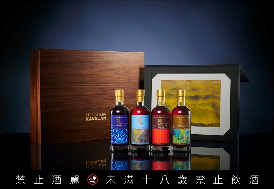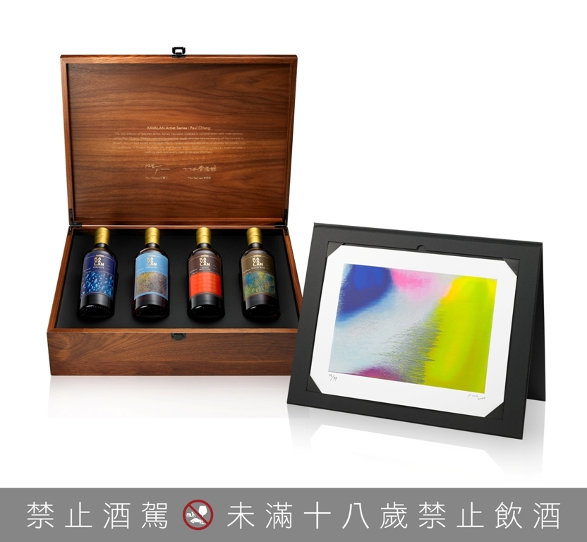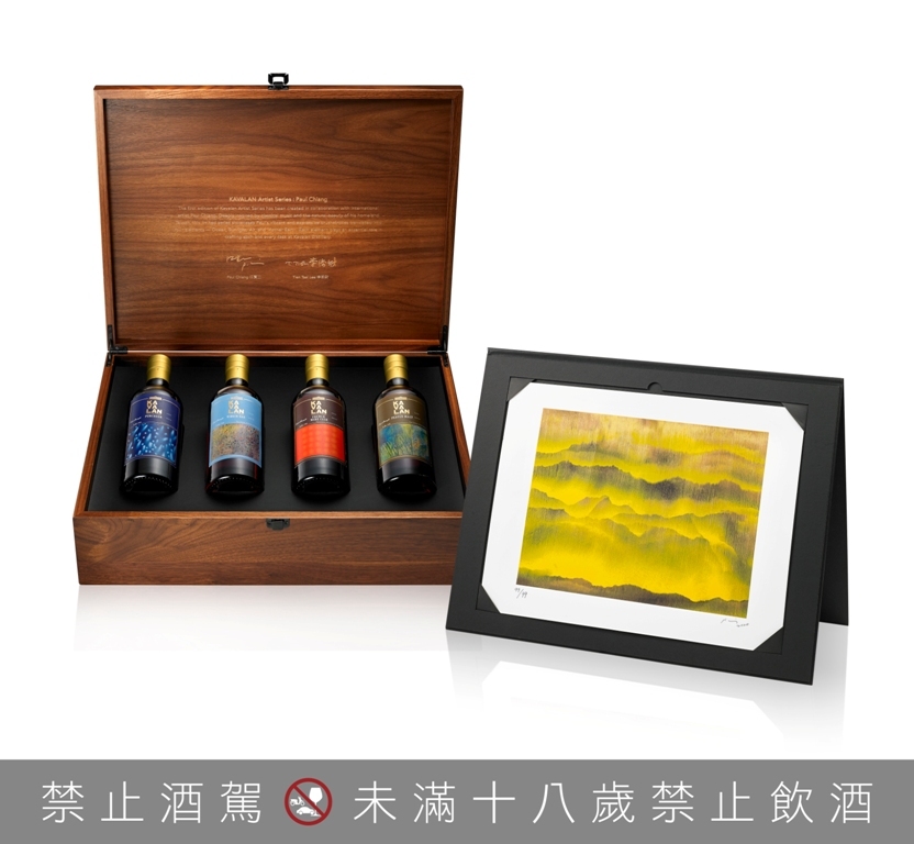 【噶瑪蘭藝術大師系列:江賢二】將海洋、空氣、陽光、大地四大元素,與藝術家江賢二的四幅重要畫作〈比西里岸之夢(海洋晨星)〉、〈乘著歌聲的翅膀〉、〈對永恆的冥想〉、〈金樽/夏〉呼應,在外盒與瓶身酒標上以完整畫幅呈現,典雅大器,各款僅限量推出1,000瓶;【噶瑪蘭藝術大師系列:江賢二 典藏組】則以藝術家油畫箱的概念,採用黑胡桃木重現創作精神,收納4瓶700ml酒款,並獨家珍藏藝術家江賢二的絹印版畫〈比西里岸之夢〉或〈臺灣山脈〉,版畫尺寸約為30*40公分,皆有藝術家江賢二親筆簽名與編號,每幅作品僅有99張,絕版限量共198組,每一組都有獨一無二的編號識別。