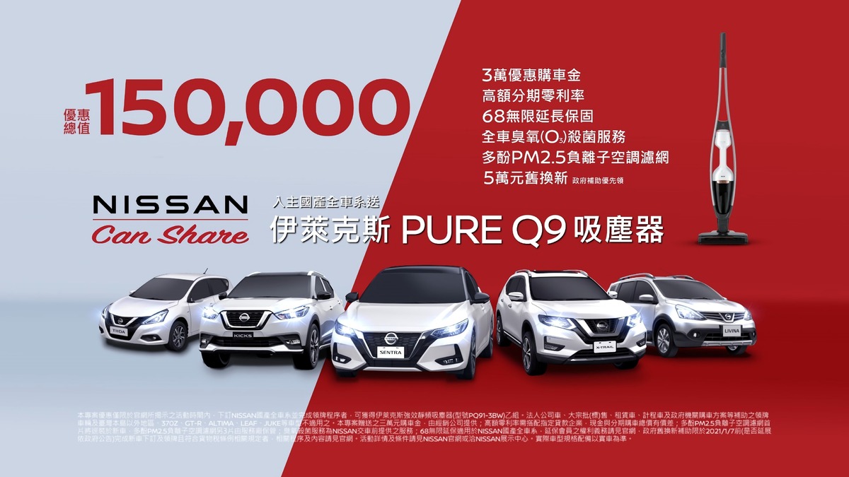 NISSAN為感謝廣大車主長期的支持與愛護,於歲末時節限時推出「NISSAN Can Share」購車優惠專案,活動期間內凡入主NISSAN國產全車系,即贈瑞典精品伊萊克斯PURE Q9強效靜頻吸塵器乙台,再享3萬元優惠購車金、多酚PM2.5負離子空氣濾網、臭氧殺菌服務、高額零利率分期、68無限延長保固,舊換新5萬元優先領專案等六大超值禮讚,最高優惠總價值達15萬元。裕隆日產誠摯邀請消費者親臨全國展示中心,體驗優質產品與貼心服務,輕鬆入主精品質感生活。詳情請參閱NISSAN官網http://www.nissan.com.tw/。
