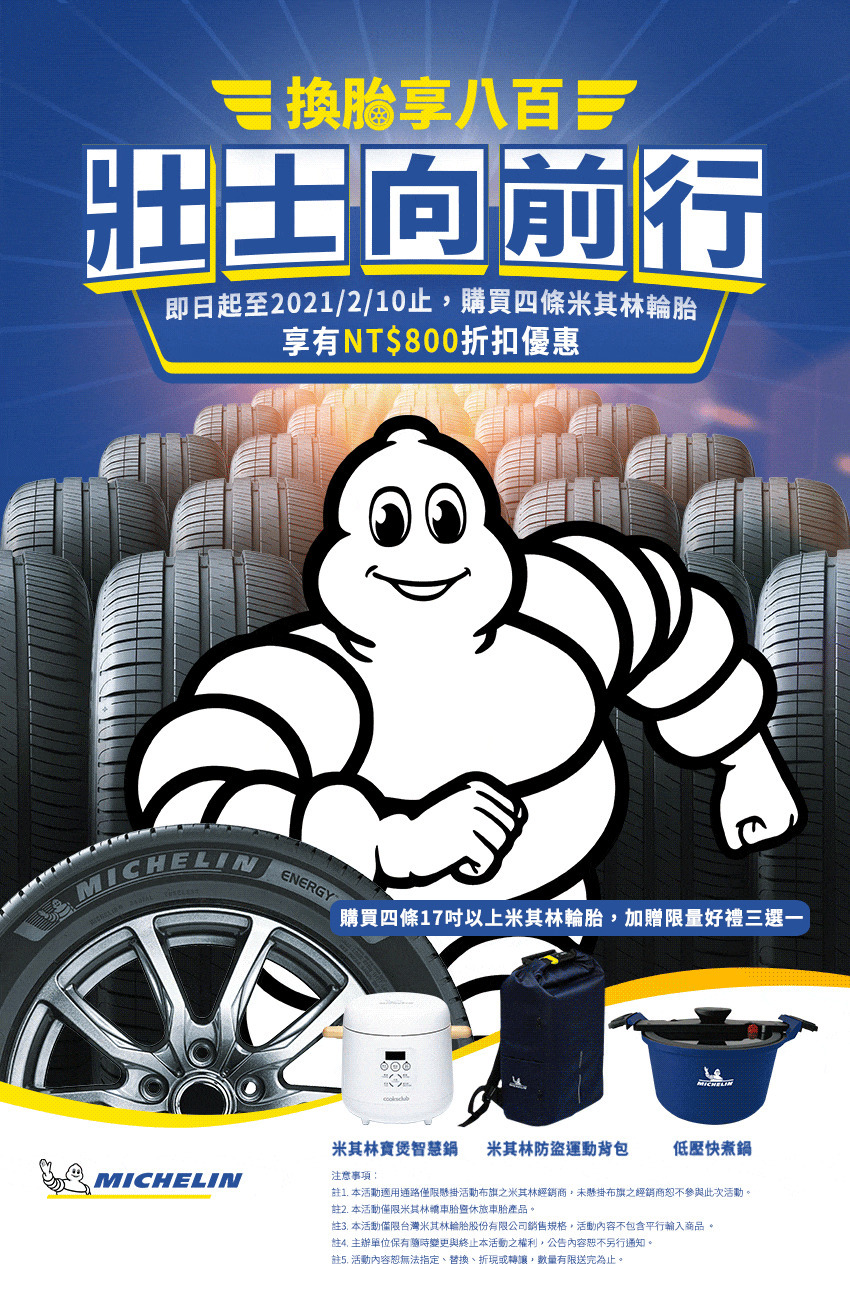 年關將近,無論是年節拜訪客戶、禮尚往來,還是規畫返鄉行程;許多車主在準備出遊的前夕,檢視愛車情況已是一家之主必備的工作。除了輪胎要符合法規所要求的胎紋深度之外,檢視輪胎胎體有無傷痕及確認胎壓狀態,更能確保上路安全。而許多車主也都會趁著過年優惠檔期將四條輪胎一次換新,四條輪胎同時換掉加上定位與校正,最能確保車輛在春節出遊時,擁有最佳的安全性及抓地力表現。因此台灣米其林自12月 1 日至2021年2月 10 日止,推出「換胎享八百 壯士向前行」活動,凡購買米其林輪胎四條全尺寸 (不含輕卡車胎),立即享有 $800 元的貼心折扣,體貼車主出遊得到周延的安全,詳盡的服務不打折!