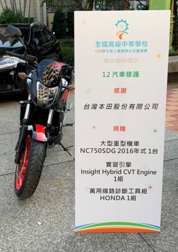 本回Honda Taiwan特別挑選響應環保潮流之Hybrid CVT油電車專用引擎,讓學生能提早接觸與現今環保議題接軌的油電技術,也捐贈在台灣持續熱銷的熱門款重機NC750SDG,除了提供競賽獲獎的學校教學使用外,後續更推動與校方簽訂的合作案、提供相關的修護知識訓練,充分展現產學合作的精神,以促進國內汽機車工業技職人材的育成及發展。