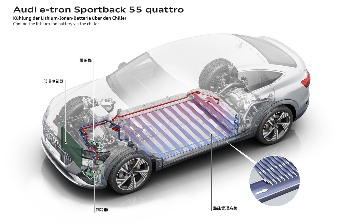 Audi e-tron 50 quattro和 55 quattro 配置的水冷式高容量鋰電池組,可分別儲存71 kWh (50 quattro) 與95 kWh (55 quattro) 總電量,搭配先進熱能管理系統,大幅提升整體充電效率。這套系統能在車輛行進間、電池模組持續供應電能時,根據低速行駛和高速或激烈操駕等不同負載情況,提供不同程度的降溫需求;僅需較低的降溫需求時,系統會透過低溫冷卻器以冷卻電池和充電器,若需要較高的降溫需求,則系統會迅速透過制冷器加以進行冷卻。整套冷卻循環迴路的管線總長度達40米,透由四組冷卻循環迴路(內部共需填充22公升冷卻劑),可確保Audi e-tron 的電池芯模組,即使在高應力水平或低溫情況下,溫度也能維持在攝氏25至35度的最佳範圍內。