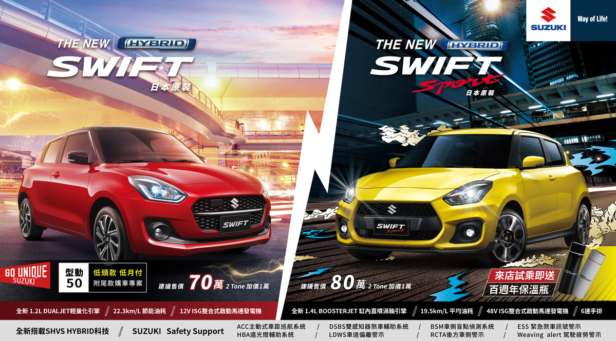SUZUKI最具代表性的跑格小車THE NEW SWIFT | SWIFT Sport,以日本原裝之姿強勢降臨台灣車壇。承襲「GO UNIQUE」的品牌理念,全新搭載HYBRID複合動力、SUZUKI Safety Support安全科技與新世代輕量化引擎,持續帶給台灣消費者凌駕想像的駕馭樂趣。