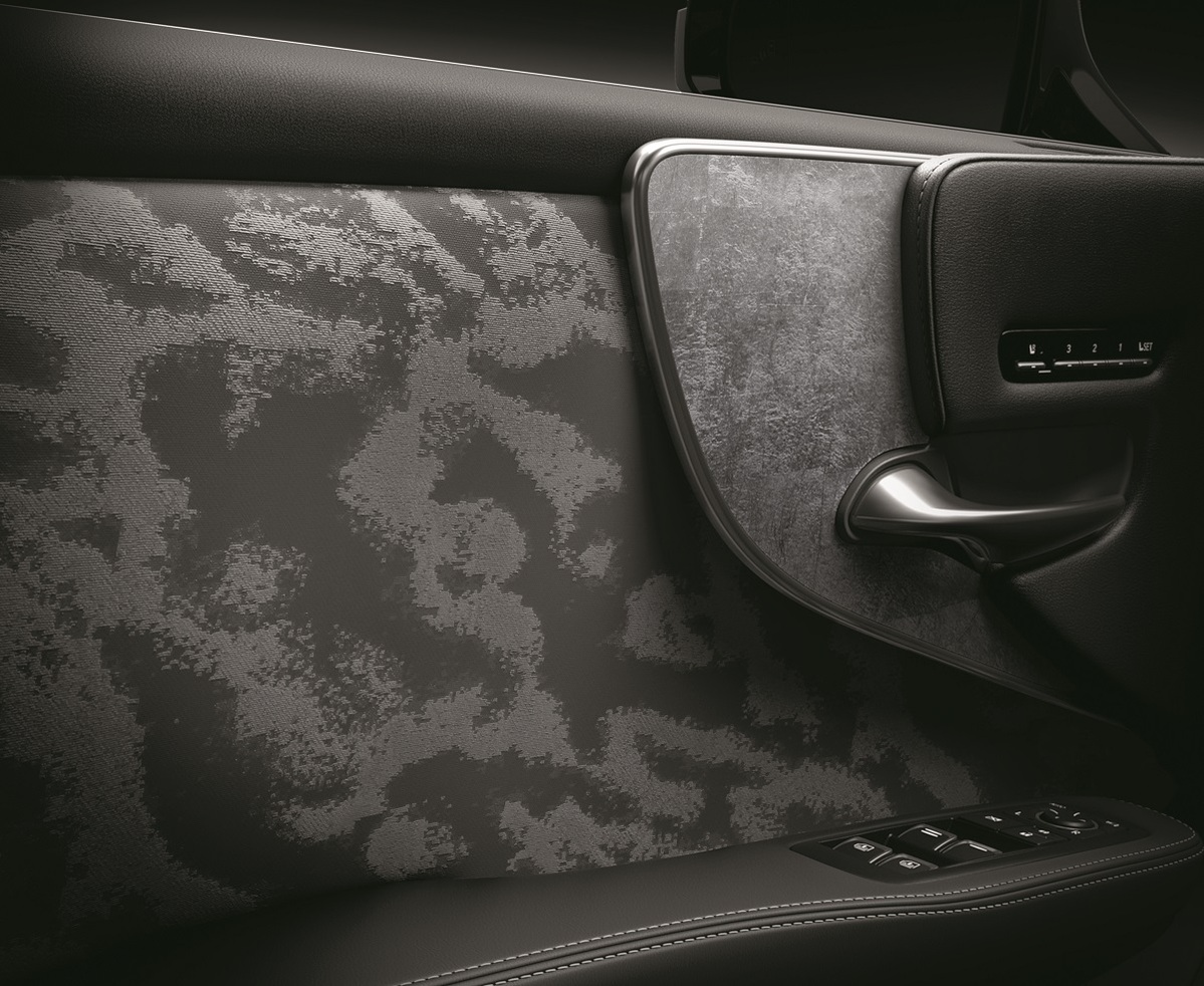 本世代LS問世時,導入KIRIKO切子與御匠摺紋飾板,以其職人細緻工法樹立豪華典範。為更進一步提升豪華氛圍,原廠設計師特別採用日本京都百年傳承工藝-西陣織(Nishijinori)融入門飾板中。西陣織以其純手工製作工法聞名於世,從日本戰國時代延傳至今,已有五百年歷史,僅用來製作高級和服、皮包及披肩等服飾,今LEXUS將其融入車室內,為世界首創,再次突破奢華境界。
