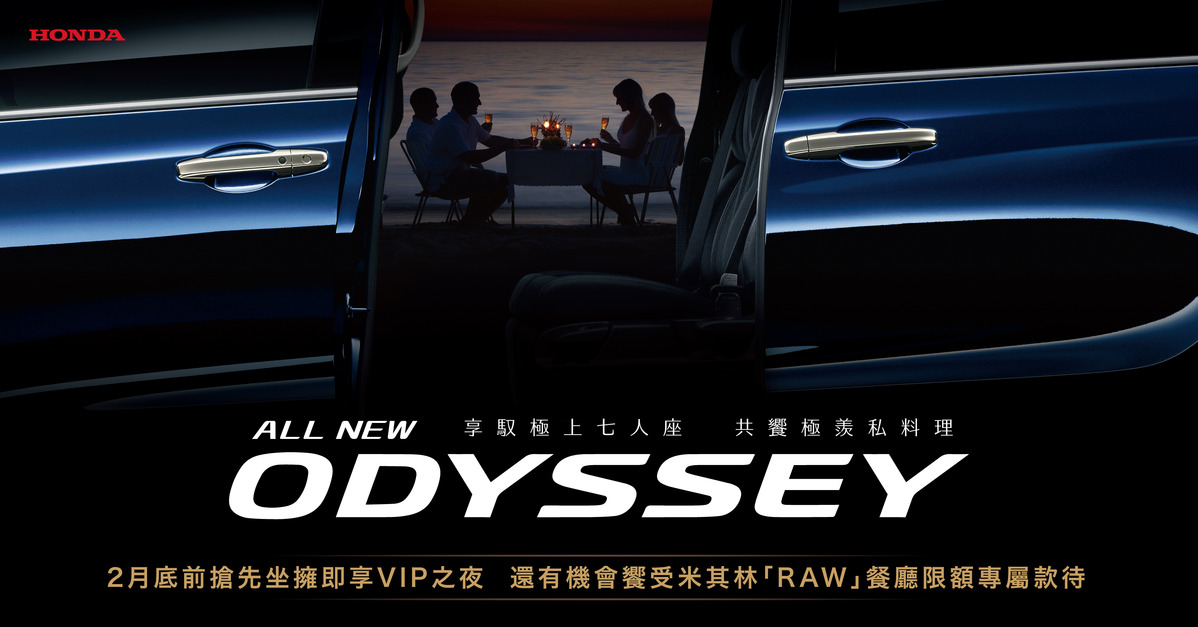 即日起,全國Honda Cars同步展開ALL NEW ODYSSEY搶先預訂禮遇活動,2月底前搶先入主ALL NEW ODYSSEY即可免費升級「五年不限里程延長保固」、並參加ODYSSEY VIP之夜,還可參加限量「享馭極上七人座 共饗極羨私料理」抽獎活動、抽中之幸運兒可獲得國際名廚江振誠「RAW極饗」之最高款待。歡迎消費者來電洽詢,Honda全方位顧客服務專線0800-666-789,或登入Honda Taiwan官方網站ALL NEW ODYSSEY活動網頁 http://www.honda-taiwan.com.tw/auto 了解更多訊息。