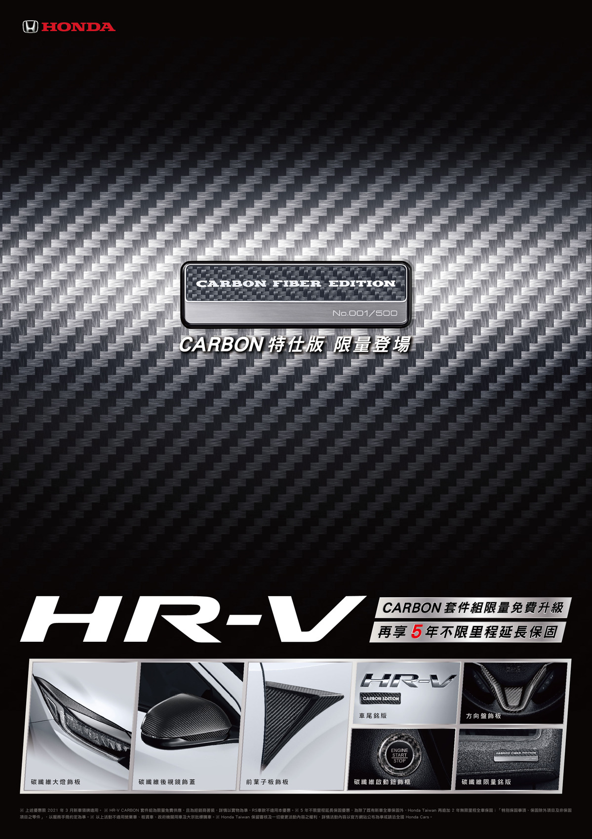 敬請 廣大消費者把握本月最佳購車良機,3月底前搶先入主HR-V,除可限量免費升級HR-V CARBON套件組外,更可免費升級 「五年不限里程延長保固」。