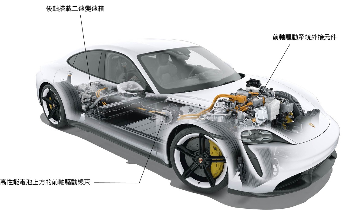 Taycan電動馬達每分鐘轉速高達 16,000 轉。前後軸的驅動單元亦分別搭載一具變速箱,以在轉速範圍內成就保時捷經典的動態表現、效能和極速的完美協作。Taycan 是史上首款後軸搭載二速變速箱的電動跑車,其中第一檔的齒比非常短,前輪動力由一組單速行星變速箱傳輸到車輪。