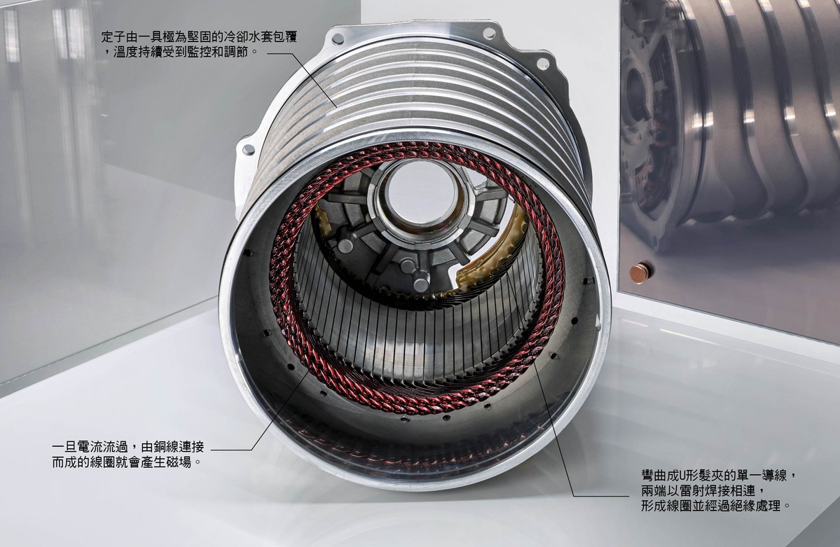 保時捷髮夾技術的優勢,在於可將銅含量從過去的50%提升至近70%,達成相同容積能夠輸出更高的動力輸出與扭力目標;另一個重要的優勢則是相鄰銅線可均勻接觸,進而改善導熱,強化髮夾定子的冷卻效果。Taycan的電動馬達可將超過 90% 的能量轉化為動力:但是,與內燃機引擎一樣,耗能會轉化為熱能,這也使得電動馬達有一層冷卻水套包覆,為其散熱。