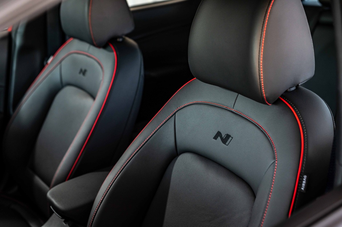 內裝部分,KONA N Line運動化三幅式多功能方向盤,銘刻 N Brand標誌,座椅、方向盤、專屬排檔頭採用N Line Red-Stitch紅色縫線,增添車室運動風格。時下講究的便利科技配備同樣不缺,駕駛座電動座椅附電動腰靠,全車系標配10.25 吋全液晶數位儀表板、HUD高質感抬頭顯示器、懸浮式8吋多媒體主機、Qi無線充電盤、後座USB充電孔等,且搭載同級唯一標配的無線 Apple CarPlay & Android Auto影音娛樂系統,讓享受駕馭性能同時亦結合數位生活的便利性。